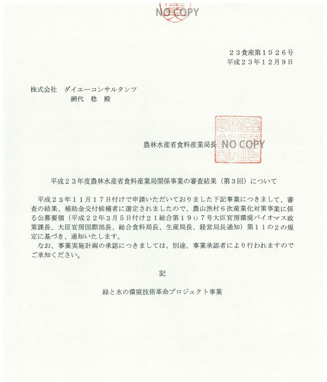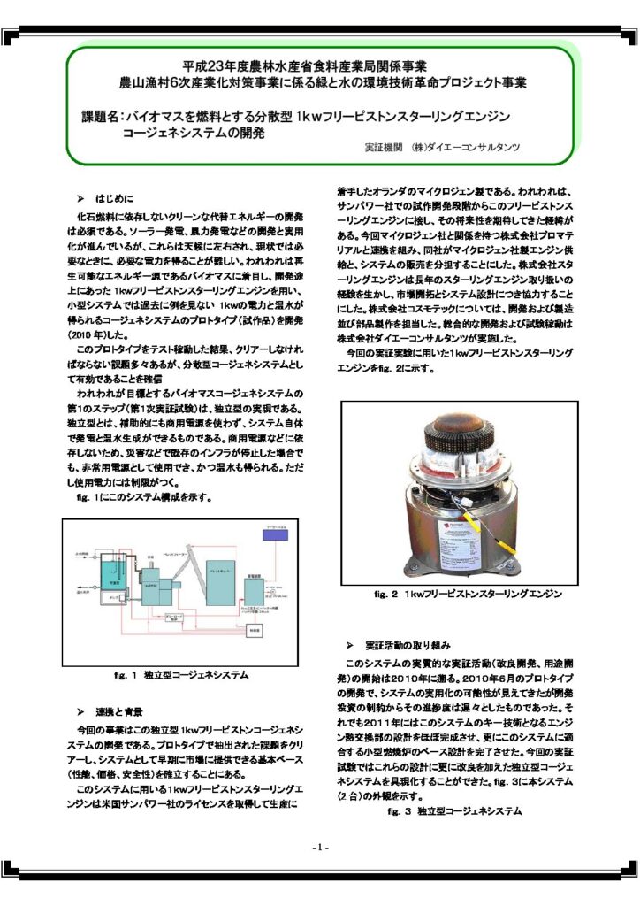 農林水産省が、 農林水産業、農山漁村に存在する豊富な資源と他産業の持つ革新的技術との融合により、素材、エネルギー、医薬品等の分野で農山漁村地域における新産業の創出を目指ざす、緑と水の環境技術革命プロジェクト事業として、「バイオマスを燃料とする分散型1Kwフリーピストン スターリングエンジンコージェネシステムの開発 」が選定され、それに伴い報告書を提出いたしました。