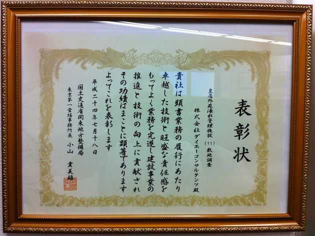 国土交通省関東地方整備局より皇居外苑濠水管理施設(11)敷地調査の業務で表彰されました