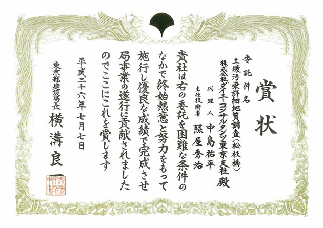 東京都より土壌汚染詳細調査(松枝橋)業務で高い評価を受け建設局長賞をいただきました