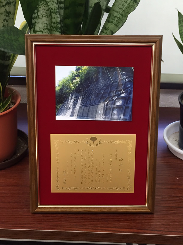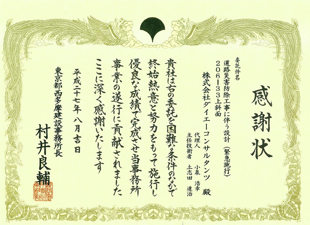 平成27年8月31日に東京都西多摩建設事務所長より表彰されました。