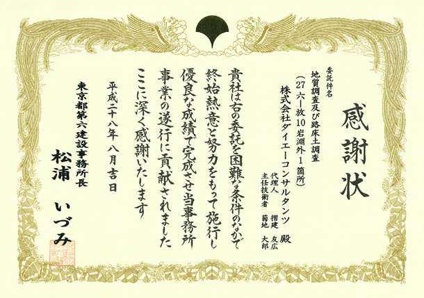 平成28年9月9日 東京都第六建設事務所より優良工事等感謝状をいただきました。