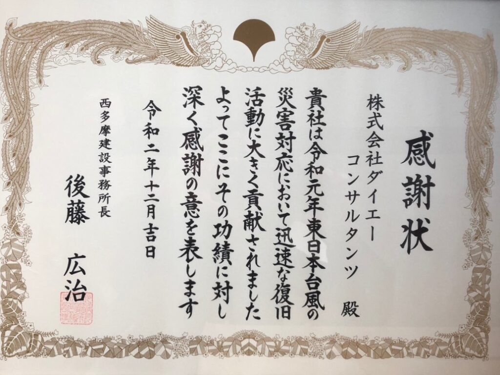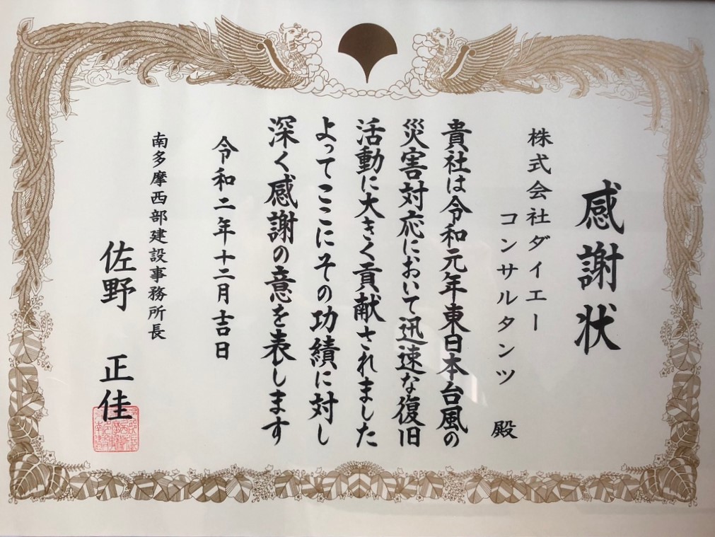 東京都建設局南多摩西部建設事務所並び同西多摩建設事務所より令和元年東日本台風の災害対応において感謝状を拝受しました。