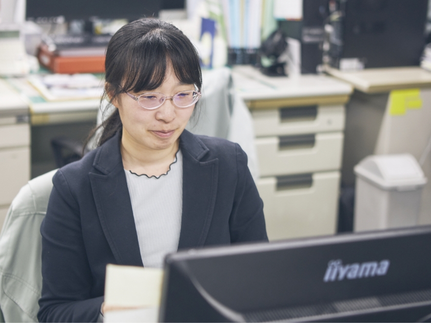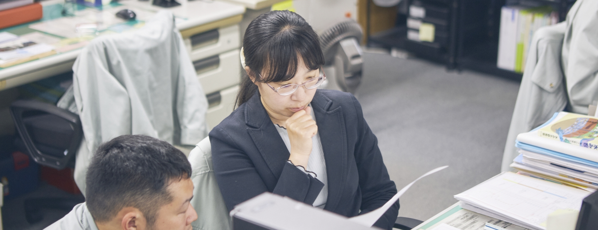 現場毎に⼯期があり、報告書の作成までが私の仕事なので、事務所にいる時間も⻑いですね。