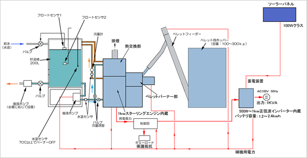 商用電源が無くても稼動、運用することができるため、災害時の非常用電力源や過疎地の発電、給湯用としても利用できる。