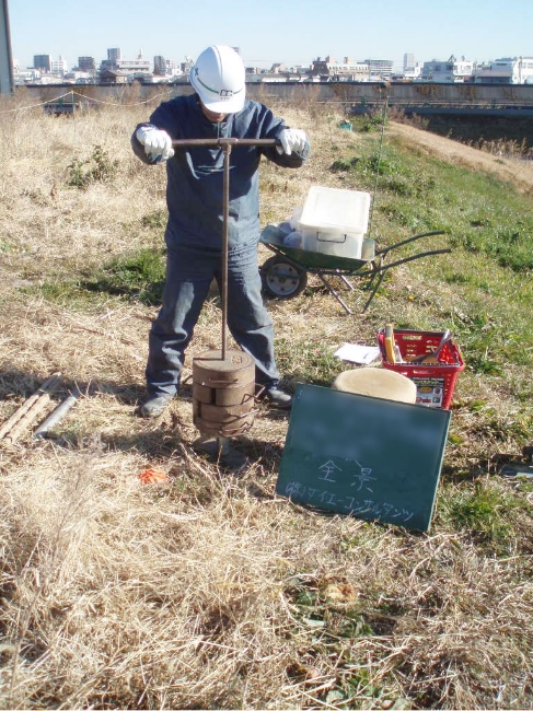 スクリューウエイト貫入試験は、荷重と回転による貫入を併用した原位置試験であり、土の静的貫入抵抗(Nsw:1m当たりの半回転数)を測定し、その硬軟や締まり具合を測定するとともに、概略の土層構成を把握することを目的とします。